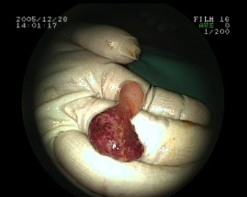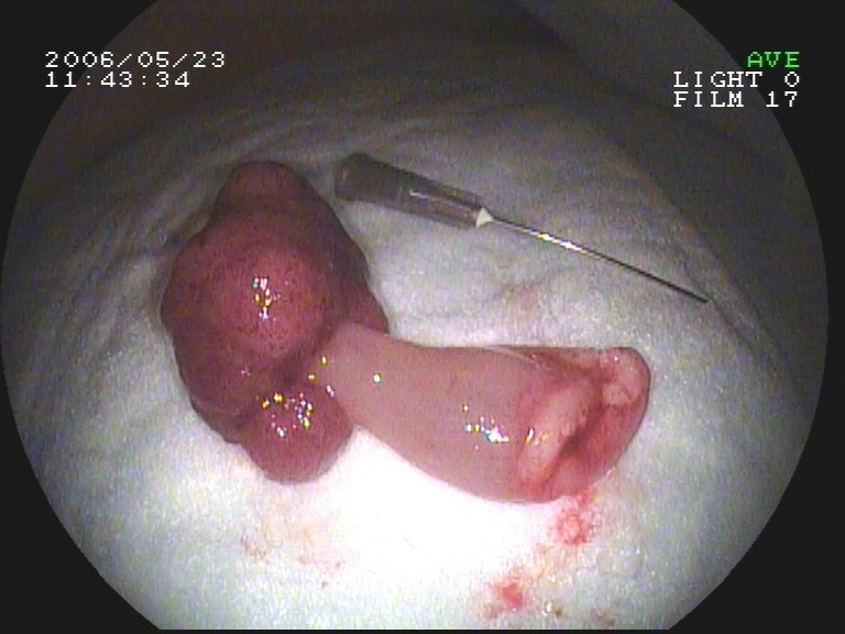 Coloskopie - gestielter hyperplastischer Dickdarmpolyp, mit einer Stromschlinge komplett abgetragen