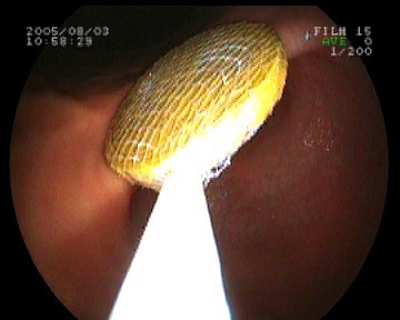 Gastroskopie - verschluckte 20-Cent-Münze im Magen - Bergung mit einer Netzschlinge